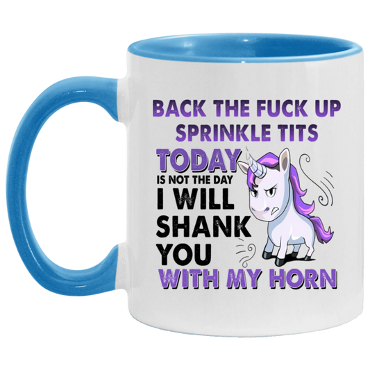 Tea cup Back The Fuck Up Sprinkle Tits Today Is Not The Day I Will Shank You With My Horn Accent Coffee Mug 2 Side, 11 oz White - Black Accent Mug On Birthday Gift Heat resistant coffee cups Capacity AM11OZ Accent Mug