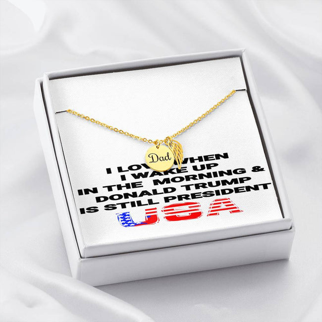 Keep Dad close to your heart with this loving Remembrance Necklace. "Dad" is engraved on the dainty hand polished coin and enhanced in black enamel, paired with a delicate polished Angel Wing tag on an adjustable cable chain measuring 18"-22" with a lobster clasp closure. Available in Polished Stainless Steel and 18k Yellow Gold over Stainless Steel. Pendant Dimensions: Circle: 0.5" (13mm), Wing: 0.625" (10mm)