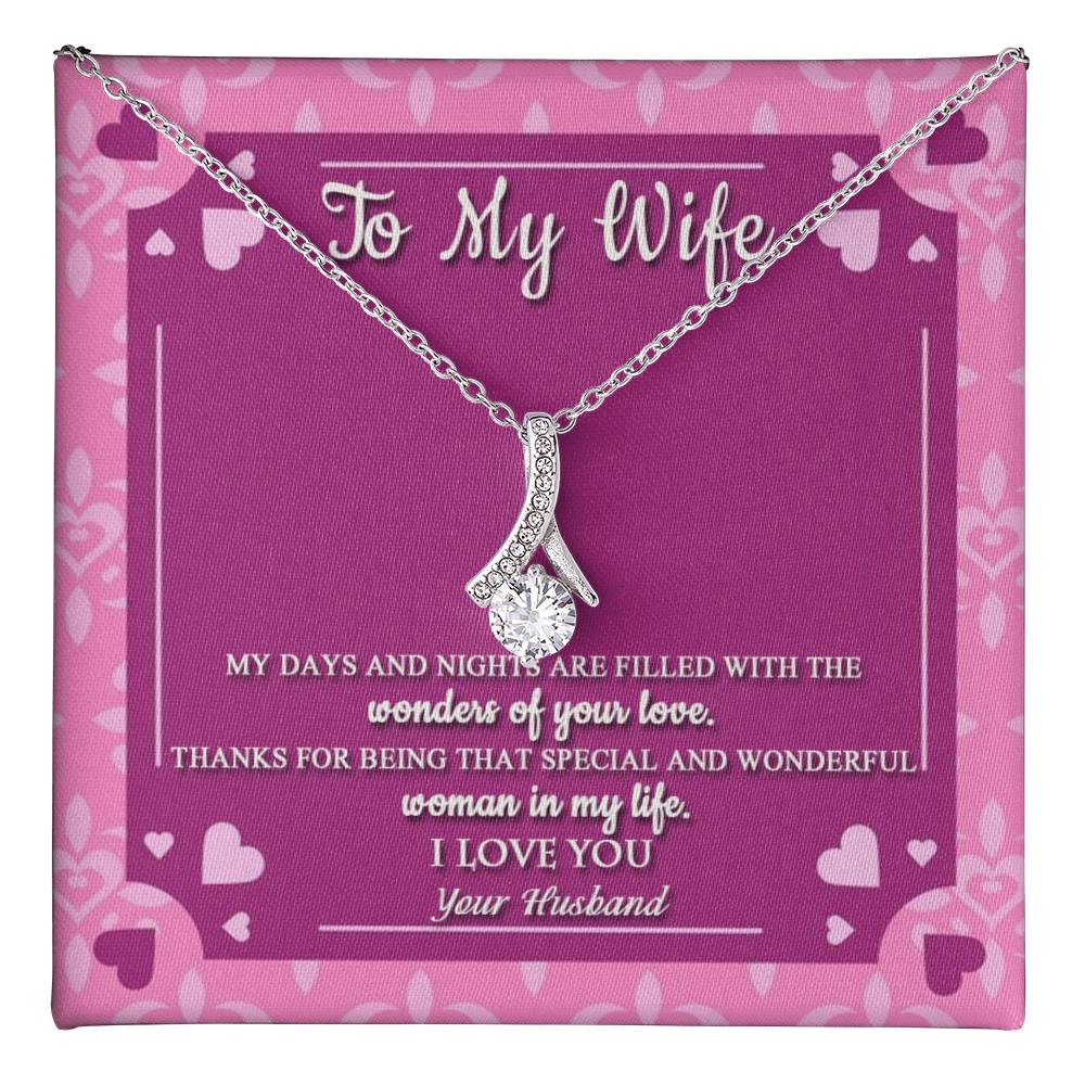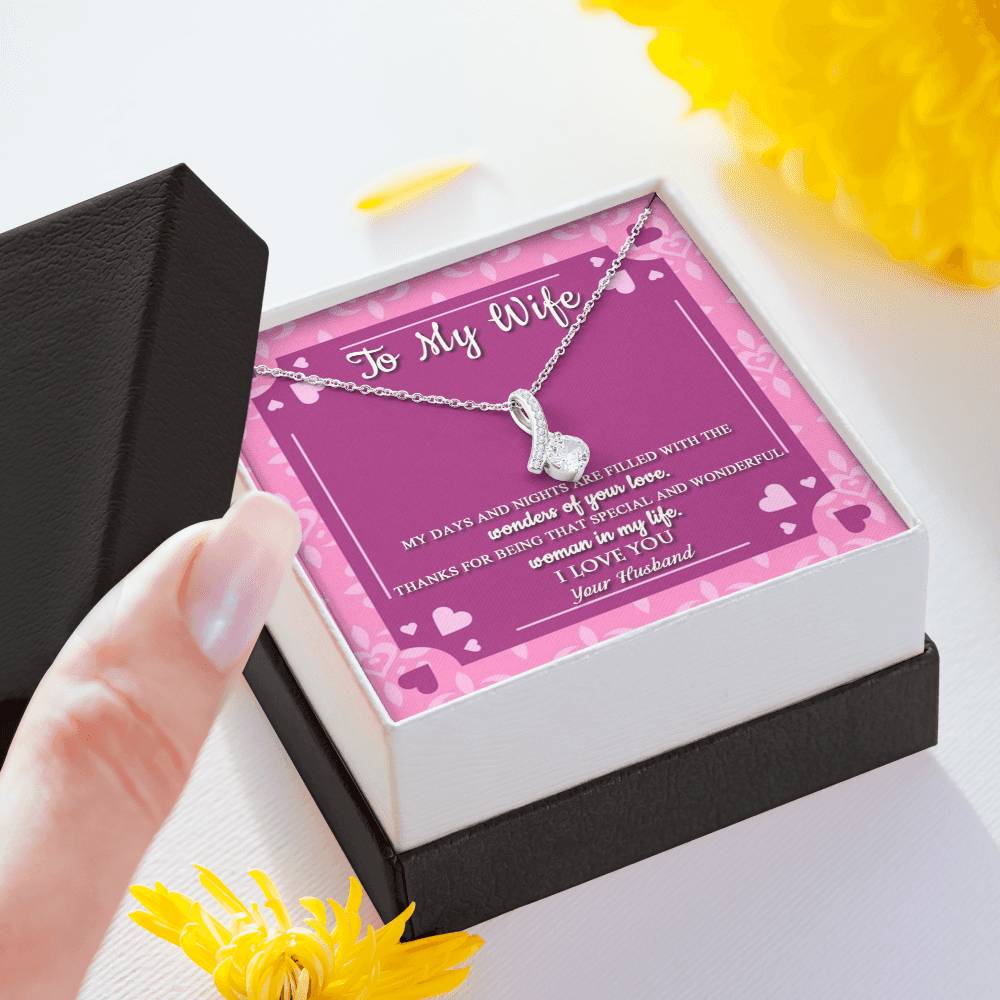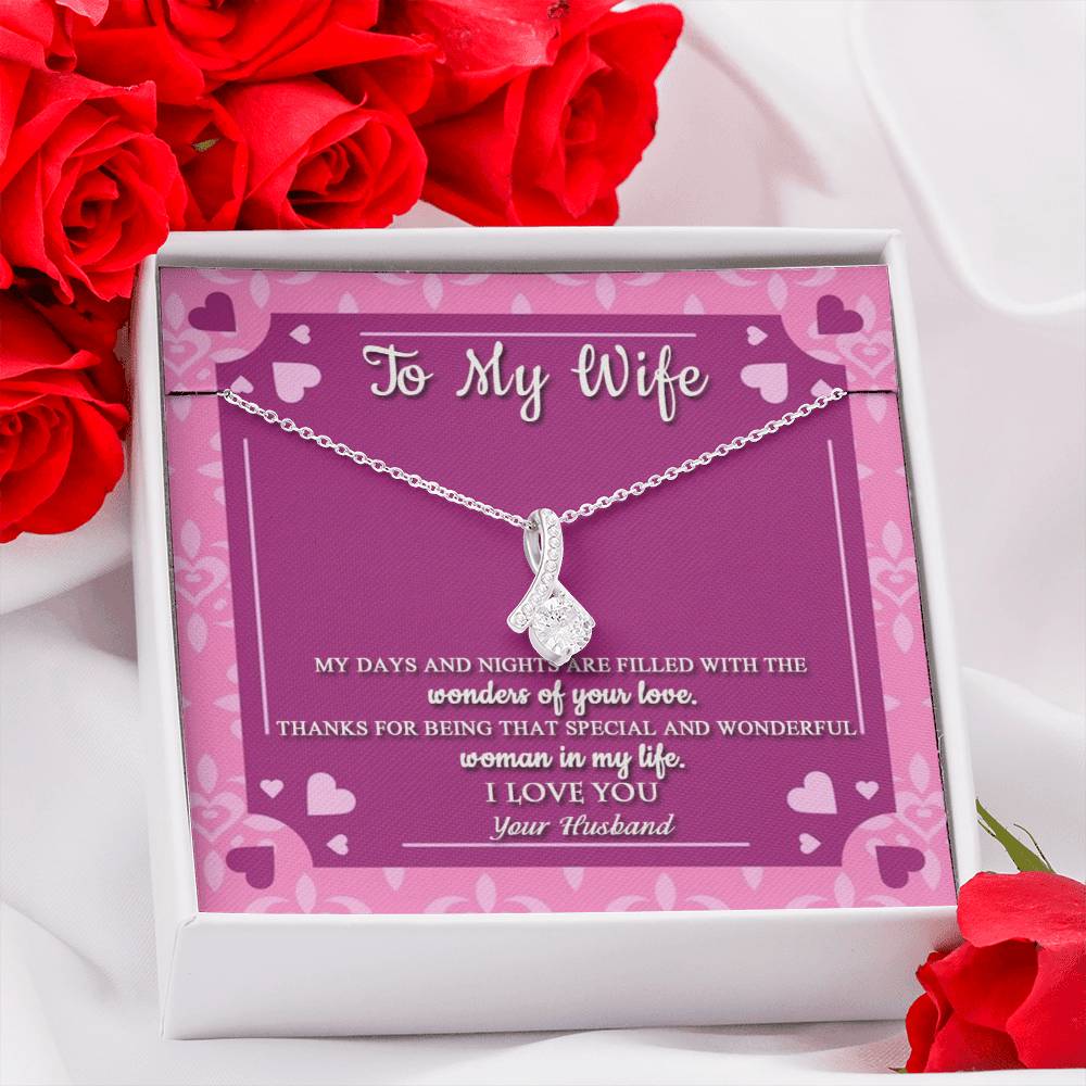 Imagine her reaction when she opens this stunning gift! The Alluring Beauty necklace features a petite ribbon shaped pendant that is sure to dazzle your special someone. Whether it's a birthday or anniversary, make sure to get her a gift she will love for years to come.