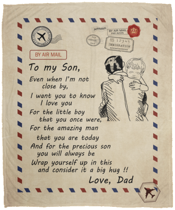 Personalized Air Mail Letter to Son Big Hug from Dad- Fleece Blankets- Gifts for Son Cozy Plush Fleece Blanket Size 50x60 inch Gift Ideas for Loved Ones VPM Cozy Plush Fleece Blanket - 50x60