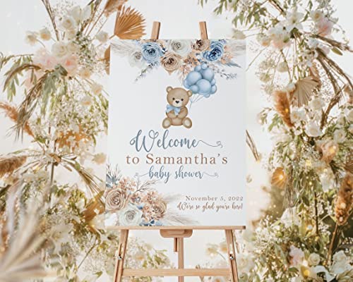 Personalized Baby Bear Shower Welcome Sign, Baby Shower Sign Boy, Blue Pampas Grass Boho Blue Bear Baby Shower Decorations, We Can Bearly Wait Sign Fullsize