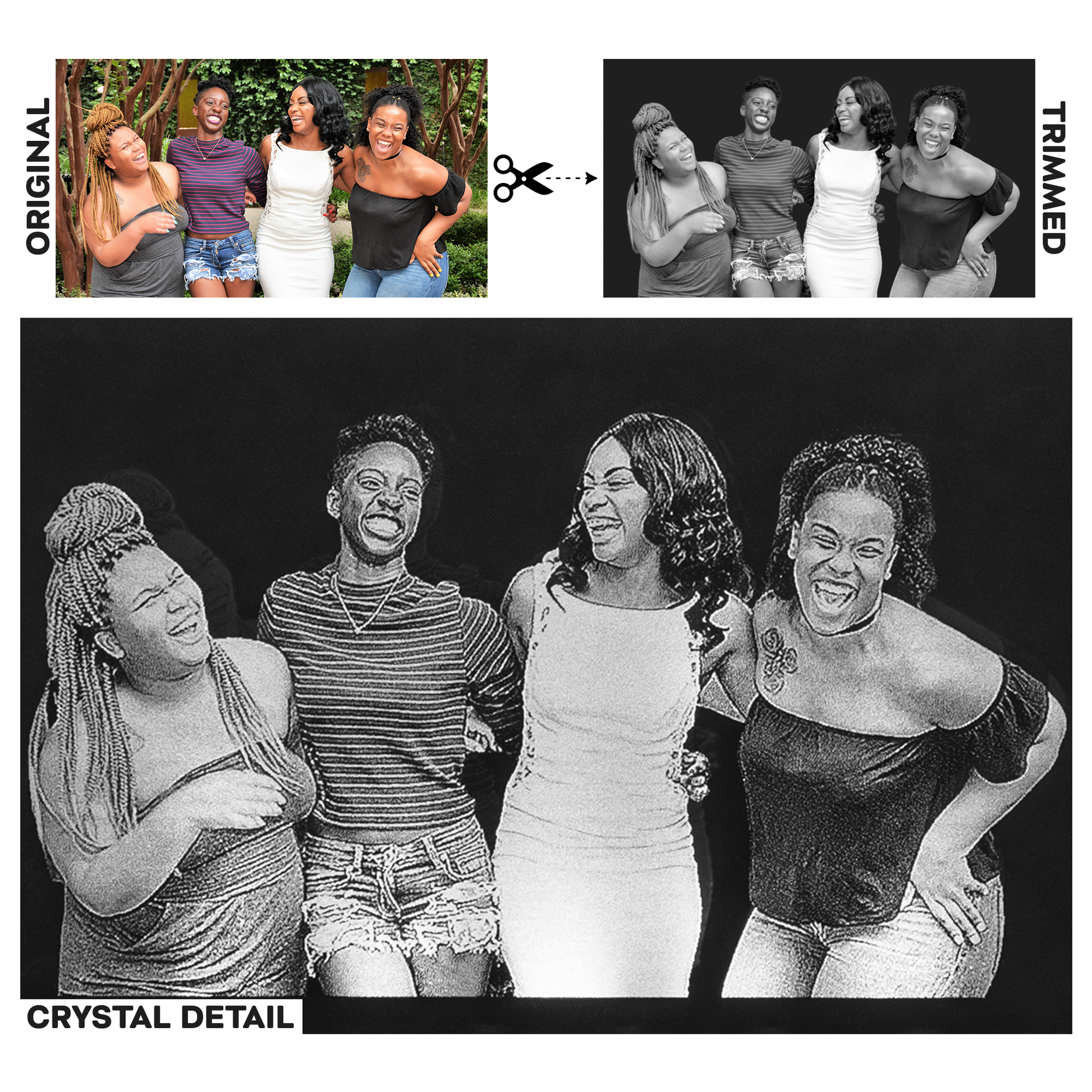 When you upload your image, you will have the ability to scale and position it within the confines of the crystal’s laser area. The background of your image will be removed using state-of-the-art software, making the subject the only portion of your image to be etched into the crystal. Keep this in mind when scaling your image as when the background is removed, you may have more empty space than originally desired.
