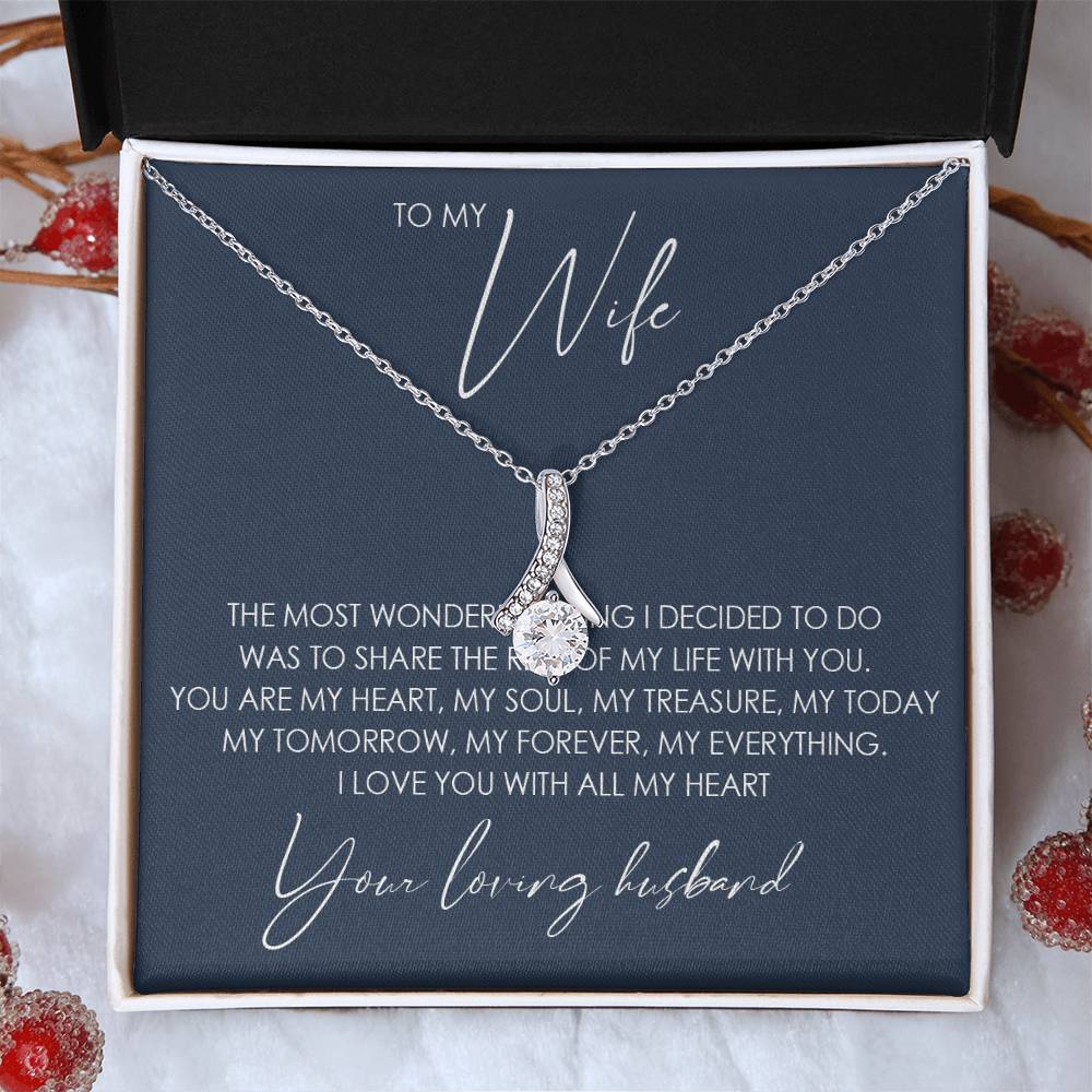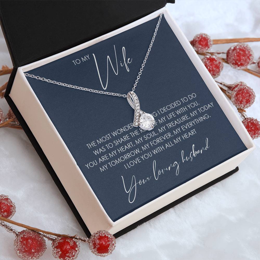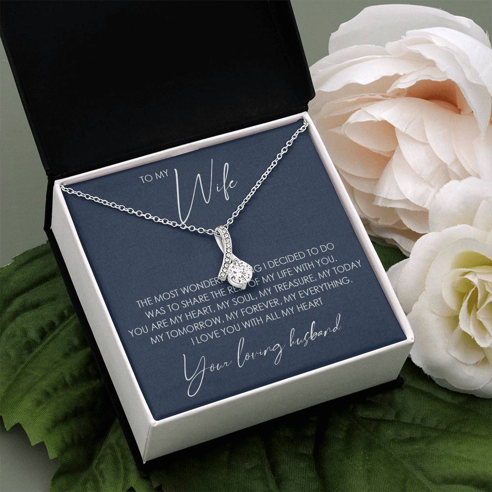 Imagine her reaction when she opens this stunning gift! The Alluring Beauty necklace features a petite ribbon shaped pendant that is sure to dazzle your special someone. Whether it's a birthday or anniversary, make sure to get her a gift she will love for years to come.