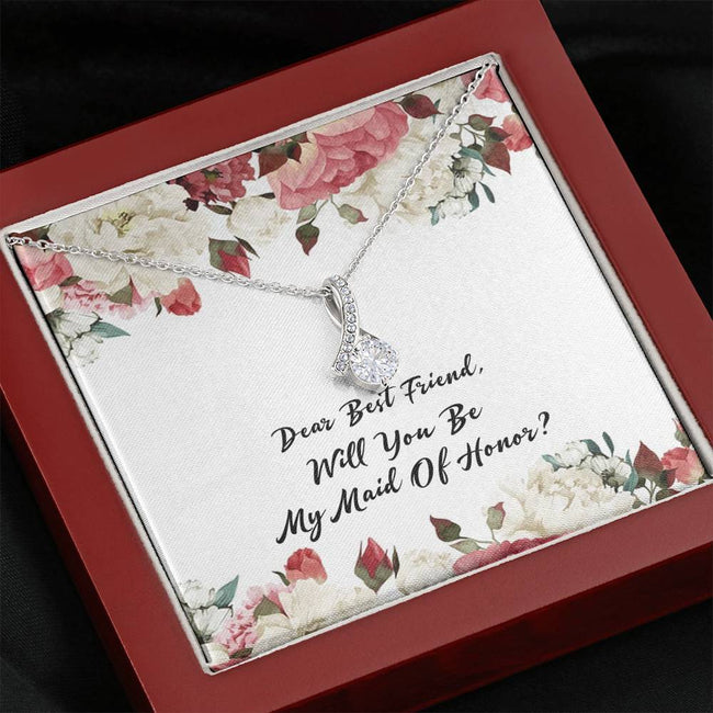 Melt her heart with this ALLURING BEAUTY necklace gift! The petite ribbon shaped pendant is finished with 14K white gold over stainless steel, and is embellished with dainty clear crystals surrounded by a sparkling 7mm round cut Cubic Zirconia.